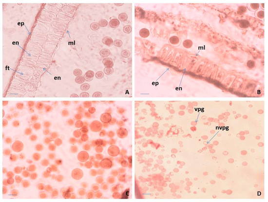 Anther and male gametophyte development. (A) Anther wall and mature pollen in an anther locule of “pin” floral morph, (B) anther wall and mature pollen, (C) mature pollen in an anther locule of “thrum” floral morph, and (D) viable and unviable pollen after acetocarmine testing. ep—epidermis; en—endothecium; ft—fibrous thickenings of the endothecium cells; ml—middle layer; vpg—viable mature pollen; nvpg—unviable mature pollen. Scale bar = 20 μm (A,B); 50 μm (C); 100 μm (D).