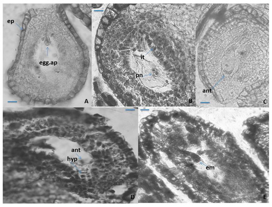 Ovule and development of the female gametophyte. (A–C) Anatropous ovule with mature Polygonum-type ES, (D) antipodals and hypostase in the ES cavity, and (E) young globular embryo with suspensor in the ES cavity. ep—epidermis; egg.ap—egg apparatus; it-integumentary tapetum pn—polar nuclei; ant—antipodals; hyp—hypostase; em—embryo. Scale bar = 20 μm (A–E).