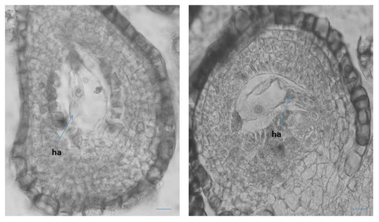 Central cell in the ES with outgrowth like haustorization (ha) to the chalaza of the ovule. Scale bar = 20 μm.