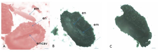 Assessment of seed (embryo) viability in P. veris after TZ testing. (A) Seed with endosperm and viable embryo, (B) seed with endosperm and unviable embryo, (C) empty seed (without embryo) unnviable. em—embryo; en—endosperm; emcav—ES cavity. Scale bar = 100 μm.