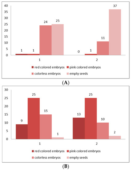To assess seed viability (fertility), the tetrazolium test [77] was applied on 50 mature seeds from plants of each of the two studied populations from the natural habitats (in situ) and from the experimental plots (ex situ) of the Institute of Biodiversity and Ecosystem Research, under controlled conditions (Table 1 and Table 2, respectively). First, the mature seeds were pre-soaked in water at 30–35 °C and then were pricked and incubated with 1% solution of 2, 3, 5-triphenyl tetrazolium chloride for 24 h at 25 °C. The principle of TZ testing is based on dehydrogenase activity in the viable seed tissues during the respiration process when dehydrogenase catalyzes initially colorless 2,3,5 triphenyl tetrazolium chloride solution into red stained formazan. If the embryo goes pink or red, there are living tissues with high respiratory activity, which has reduced the tetrazolium chloride (colorless) to formazan (pinkish-red) via dehydrogenase enzyme. The seeds (embryos) with lower viability and colorless embryos were considered unviable (unfertile). Thus, assessing the staining intensity, the seeds (embryos) were evaluated (Figure 1). The observations and microphotographs for assessment of the seed viability were made with light microscope “Olympus” CX21 and an “Infinity lite” digital camera 1.4 Mpx, respectively.