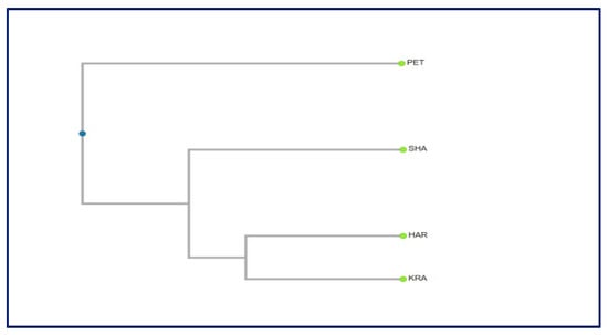 The dendrogram constructed based on the genetic distances among populations revealed that there is no relationship between the geographic and genetic distances (Figure 8). The population Petrohan (Western Stara planina) can be clearly distinguished, and the other three populations are closer to each other. The lack of clear spatial subdivision in the grouping of populations is probably due to the small sample size. It would be worth including other populations in the study, and then we could expect to get more clear relationships and trends in the distribution of the genetic diversity and to draw more definite conclusions.