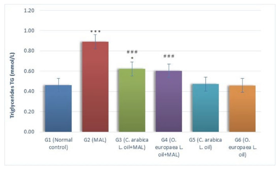 Influence of Coffea arabica L. oil and Olea europaea L. oil on the serum triglyceride levels. When a comparison was made against the normal control group, a significant difference was found in the mean values at p ≤ 0.05 *; p ≤ 0.001 ***. When a comparison was made against the MAL-intoxicated rats, a significant difference was found in the mean values at p ≤ 0.001 ###.