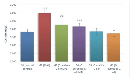 Influence of Coffea arabica L. oil and Olea europaea L. oil on the serum LDL-c levels. When a comparison was made against the normal control group, a significant difference was found in the mean values at p ≤ 0.05 *; p ≤ 0.001 ***. When a comparison was made against the MAL-intoxicated rats, a significant difference was found in the mean values at p ≤ 0.01 ##; p ≤ 0.001 ###.