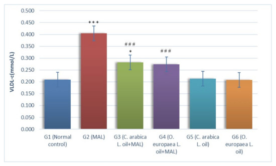 Influence of Coffea arabica L. oil and Olea europaea L. oil on the level VLDL-c. When a comparison was made against the normal control rats, a significant difference was found in the mean values at p ≤ 0.05 *; p ≤ 0.001 ***. When a comparison was made against the MAL-intoxicated rats, a significant difference was found in the mean values at p ≤ 0.001 ###.