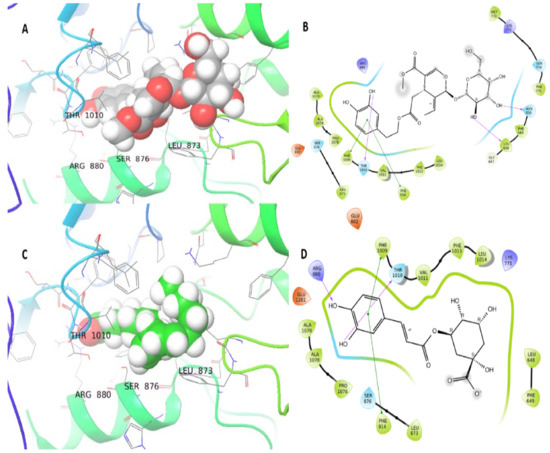 3D and 2D interaction of HMGR (1HWK) protein, the ligands are shown in black at protein center, and the protein backbones are shown in ribbons, hydrogen bonds are shown in purple arrows, bi-bi stacking is shown in green lines. (A,B): Three-dimensional and two-dimensional interface of chlorogenic acid. (C,D): Three-dimensional and two-dimensional interface of HMGR protein and oleuropein ligand.