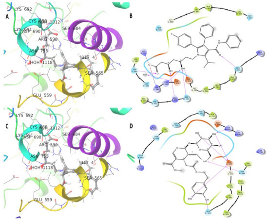 The HMGR (1HWK) protein showed the best interaction with chlorogenic acid (−10.6 kcal/mol) and oleuropein (−8 kcal/mol) (Table 1). There were eight hydrogen bonds formed with Ser565, Glu559, Arg590, lys691, Lys692, Ser684, Lys735, and Asn755 (Figure 7A,B). The oleuropein compound exhibited a −8 kcal/mol docking score and six hydrogen bonds with Lys691, Glu559 (three bonds), Ser684, Ser565 residues of HMGR protein (Figure 7C,D). The redocking of co-crystalized ligand (Atorvastatin) of HMGR protein showed a −12.3 kcal/mol docking score.