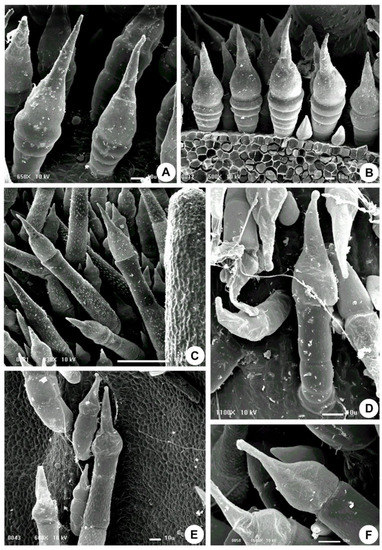 - Inamdar, J.A.; Gangadhara, M. Studies on the trichomes of some Euphorbiaceae. Feddes Repertorium 1977, 88, 103–111. [Google Scholar] [CrossRef]