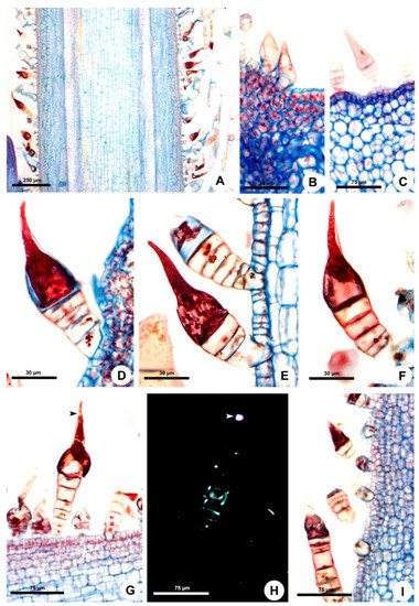 - Metcalfe, C.R.; Chalk, L. Anatomy of Dicotyledons; Clarendon Press: Oxford, UK, 1950. [Google Scholar]