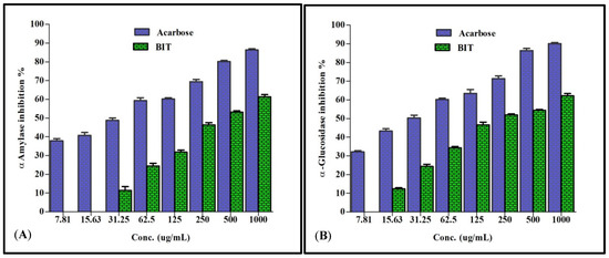 Inhibition% of Buddleia indica leaves total methanol extract (BIT) and acarbose at different concentrations versus α-amylase (A) and α-glucosidase (B).