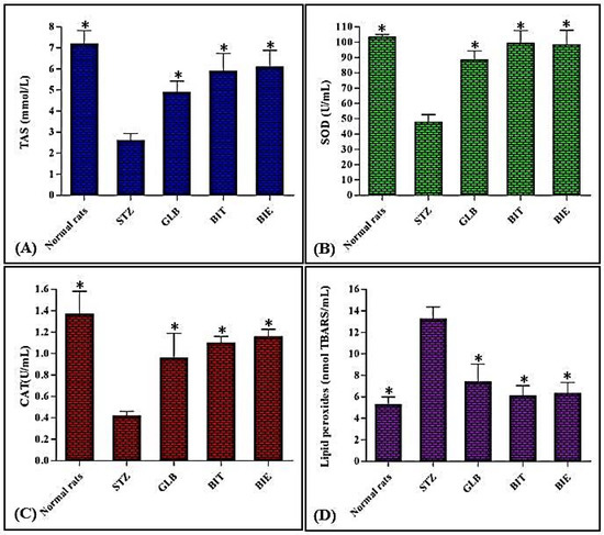 Effect of BIT and BIE oral administration on the oxidative stress markers; TAS (A), SOD (B), CAT (C) and lipid peroxides (D) in STZ-diabetic treated rats. Data are presented as means ± S.E.M. (measured in triplicates; n = 3), * significantly different from STZ at p < 0.05.