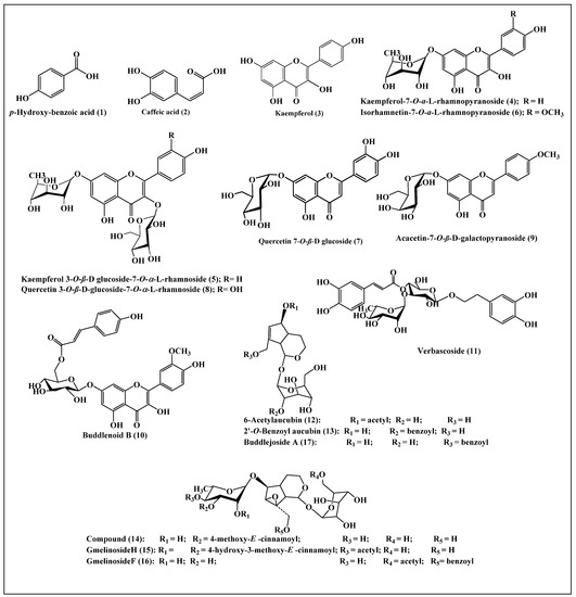 Buddleia indica leaves are rich in polyphenolic compounds comprising flavonoids, phenolic acids, phenyl propanoids as well as iridoids. Several compounds have been previously reported by the authors with regard to the Buddleia indica leaves total methanol extract, which are p-hydroxy-benzoic acid, kaempferol-7-O-α-L-rhamnopyranoside, 6-acetylaucubin, gmelinoside H, catalpol 6-O-[4-methoxy-E-cinnamoyl-(3)-α-L-rhamnopyranoside, buddlenoid B, gmelinoside F, isorhamnetin 7-O-α-L-rhamnopyranoside. verbascoside, acacetin-7-galactoside, buddlejoside A and 2′-O-benzoyl aucubin using LC-ESI-MS [8]. Besides, p-hydroxy benzoic acid, caffeic acid, quercetin 3-O-β-D-glucoside-7-O-α-L-rhamnoside, kaempferol 3-O-β-D-glucoside-7-O-α-L-rhamnoside, quercetin 7-O-β-D glucoside, and kaempferol were isolated and structurally elucidated from the ethyl acetate fraction of Buddleia indica leaves total methanol extract using different chromatographic and spectroscopic techniques [9]. A scheme showing the major phytoconstituents present in Buddleia indica leaves, which are p-hydroxy benzoic acid (1), caffeic acid (2), kaempferol (3), kaempferol-7-O-α-L-rhamnopyranoside (4), kaempferol 3-O-β-D-glucoside-7-O-α-L-rhamnoside (5), isorhamnetin 7-O-α-L-rhamnopyranoside (6), quercetin 7-O-β-D-glucoside (7), quercetin 3-O-β-Dglucoside-7-O-α-L-rhamnoside (8), acacetin-7-galactoside (9), buddlenoid B (10), verbascoside (11), 6-acetylaucubin (12), 2′-O-benzoyl aucubin (13), catalpol 6-O-[4-methoxy-E-cinnamoyl-(3)-α-L-rhamnopyranoside (14), gmelinoside H (15), gmelinoside F (16), and buddlejoside A (17) is illustrated in Figure 3.