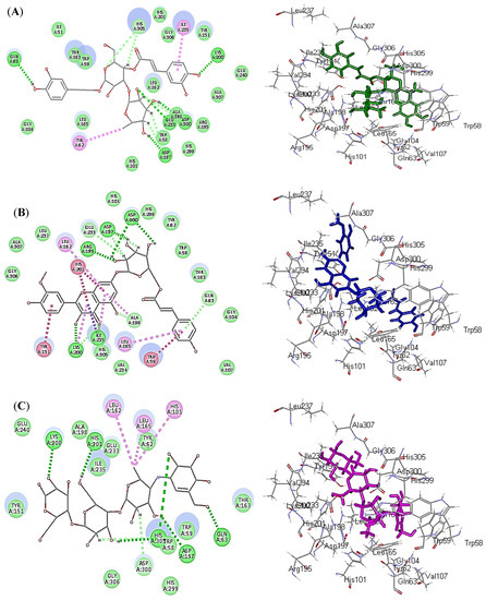 2D and 3D binding modes of verbascoside (A), buddlenoid B (B) and acarbose (C) within the active sites of human α-amylase (HA); heavy green dotted bond, H-bonds; heavy pink dotted bond, π-π bonds; light green dotted bond, C-H bonds; light pink dotted bond, π-alkyl bonds; purple dotted bond, π-δ bond.