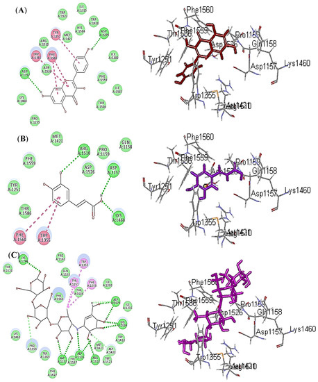However, caffeic acid forms three conventional hydrogen bonds with Asp1157, Lys1460 and Arg1510; two π-π bonds with Phe1560 and Trp1355 (Figure 5B). Meanwhile acarbose forms ten conventional hydrogen bonds with Asp1526, Asp1279, Asp1157, Lys1164, His1584 and Arg1510; two C-H bonds Pro1159 and Met1421; three π-alkyl bonds with Tyr1251, Phe1559 and Trp1355 (Figure 5C). In addition, all of these compounds form Van der Waals interactions with most of the amino acid moieties present at the active site of both enzymes.