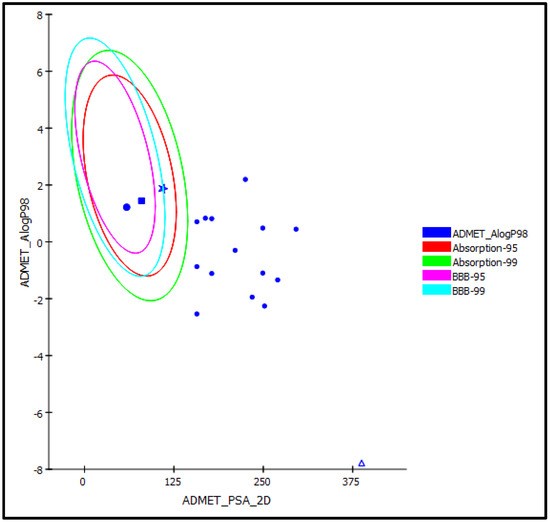 ADMET Plot for bioactive compounds from Buddleia indica leaves displaying 95% and 99% confidence limit ellipses corresponding to the blood-brain barrier (BBB) and the human intestinal absorption models; p-hydroxy benzoic acid (1) (large filled circle); caffeic acid (2) (filled square), kaempferol (3), (star); and acarbose (triangle) in ADMET_AlogP98.