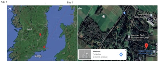 (a) Site locations in Republic of Ireland; (b) field sampling location of site 1, 52.295957 N & −6.509603 W, source Google maps.