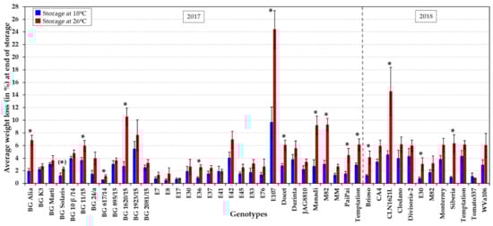 Fruit weight loss during storage at 18 °C vs. 26 °C. 31 HT varieties, six HS accessions (BG Solaris, BG 24/a, CA4, Clodano, E30 and E41) and four control genotypes (JAG8810, Docet, MM and M82) were assessed. The average fruit weight loss during the entire storage period is shown as a percentage (fruit weight at the start of storage (at B + 14) minus the fruit weight at the end of the storage period/initial weight) of, on average, 8–9 fruits per genotype at 18 °C (dark blue columns) and 26 °C (dark red columns), respectively. The error bars indicate ± SE. An asterisk indicates a significant difference (p < 0.05 or p ~ 0.05 when in parenthesis) in weight loss at 18 °C vs. 26 °C for each genotype. Statistical analyses are presented in Figure S2, including the comparison between genotypes at each temperature.