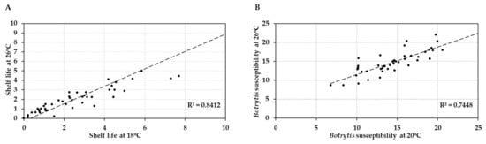 Comparison of the post-harvest properties of the 41 tomato accessions at the two temperature regimes showed that the shelf lives of the different genotypes were strongly correlated (R = 0.917/R2 = 0.84) at normal and elevated temperature (18 °C vs. 26 °C; Figure 4A). Likewise, susceptibility to Botrytis infection was highly correlated (R = 0.863/R2 = 0.745) at the two temperatures (20 °C vs. 26 °C; Figure 4B). Genotypes with either good shelf life or low Botrytis susceptibility maintained their performance when the temperature was raised by 6–8 °C, with an average penalty of performance across all accessions of 11%. However, shelf life and Botrytis susceptibility were not correlated (R = −0.0298/R2 = 0.0009 and R = −0.074/R2 = 0.0054, respectively) with each other at either normal or elevated temperature (Figure 5). Therefore, fruit shelf life was not a reliable indicator of fungal susceptibility of fruit post-harvest.