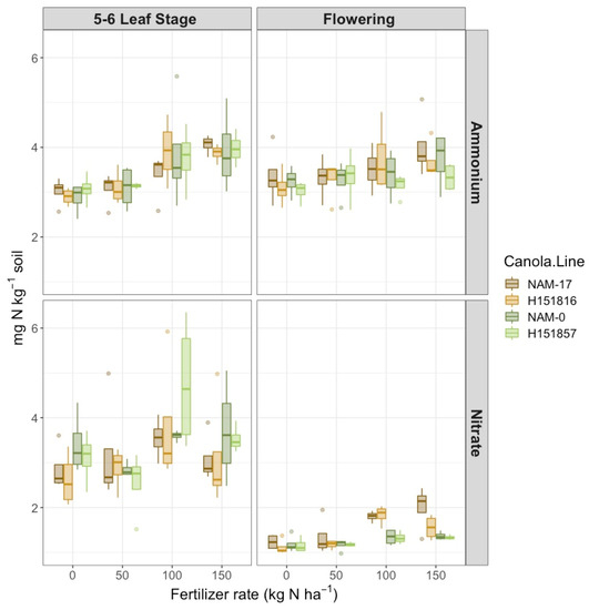 There was a two-way interaction between fertilizer N rates and phenological stage on soil NH4+-N concentration (Table 1), where NH4+-N concentration was highest under the 150 kg ha−1 N rate at both phenological stages and lowest under the 0 kg ha−1 N rate at the 5–6 leaf stage (Figure 1). Canola varieties did not affect soil NH4+-N nor soil NO3−-N concentrations. However, there was a two-way interaction between canola variety and phenological stage on soil NO3−-N concentration (Table 1). Soil NO3−-N concentrations were highest and highly variable at the 5–6 leaf stage, but unlike soil NH4+-N, soil NO3−-N was less variable at flowering (Figure 1). At flowering, soil NO3−-N was lowest under the experimental hybrid H151857 and its parental genotype NAM-0, and was highest under NAM-17; soil NO3−-N was most similar between hybrid–parent pairs (Figure 1). Soil NO3−-N concentrations increased with increasing urea-N fertilizer rates at both phenological stages (Figure 1).