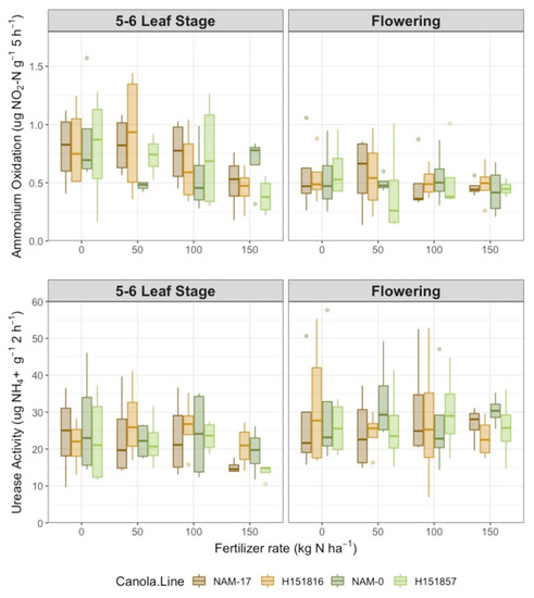 We explored the hypothesis that canola varieties with higher soil N cycling would have higher NUE. A recent study proposed that higher NUE in hybrid canola may be associated with increased below-ground interactions that result in better scavenging of native soil and fertilizer N [15]. Although NUE was higher under hybrids than parental varieties, we did not observe varietal differences in soil N cycling, but rather a strong phenological effect. We demonstrated that canola NUE correlated positively with soil urease activity and potential ammonium oxidation rates at the 5–6 leaf stage. Greater soil N cycling resulted in higher concentrations of plant-available N, though plant phenology constrained these results. Ammonium oxidation rates were higher earlier in the growing season, likely driven by urea-N fertilizer application, resulting in higher soil NO3− concentrations for plant N uptake. As plants developed, soil NO3−-N concentrations declined, likely due to increased canola N demands [50]. Plant N uptake negatively correlated with soil NO3−-N concentrations, supporting this idea [39]. Therefore, the production of soil mineral N through soil N cycling likely resulted in high canola NUE, with greater soil N availability resulting in higher soil N acquisition. Our sampling depth was limited to the soil surface; expanding sampling depth, possibly to 40 cm, may better explain genotypic differences in soil N availability and N cycling since up to 85% of the canola root mass is located in the 0–40 cm soil depth [51]).