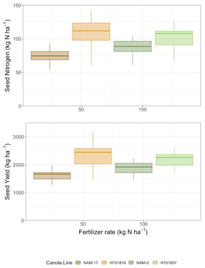 Yield (kg ha−1) and seed N uptake (kg ha−1) over four diverse canola varieties and four varying N treatment rates (n = 4).