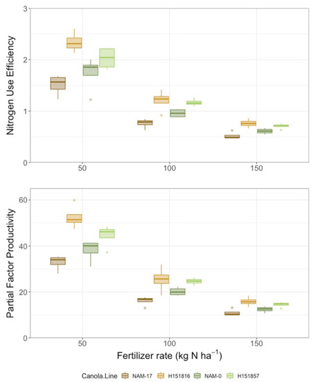 Nitrogen use efficiency (NUE) and partial factor productivity over four diverse canola varieties and three varying N treatment rates (n = 4).