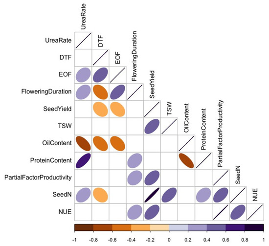 Spearman’s rank correlation coefficient (p < 0.05) of Category B variables showing correlation (r) among urea-N rate, % oil content, nitrogen use efficiency (NUE), thousand-seed weight (TSW), seed yield, seed N, start of flowering (DTF), % protein content, end of flowering (EOF), partial factor productivity, and duration of flowering in varying canola varieties. Colours and shapes of ellipses indicate the strength of the correlations, with only significant correlations at a confidence level of 95% depicted. Positive and negative correlations are depicted by the respective direction of each ellipse, and positive correlations are depicted with the colour purple and negative correlations are depicted with the colour orange.