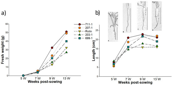 Measurements of carrot tap roots at 5, 7, 9, and 13 weeks post sowing. (a) Fresh weight (g) and (b) root length (cm) with a carrot scheme representing the general aspect of carrot tap roots at (A) 5, (B) 7, (C) 9, and (D) 13 weeks post sowing. The vertical bar in (b) indicates the part of the tap root used for length measurement.
