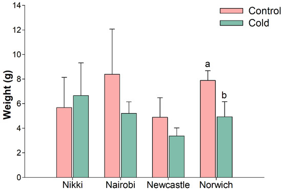 Root fresh weight seven days after initiation of cold challenge experiment in carrot cultivars ’Nairobi’, ‘Newcastle’, ‘Nikki’, and ‘Norwich’. Plants from control were always grown at 25 °C and samples from cold treatment were grown at 5 °C during seven days. Significant difference in cultivar ‘Norwich’ is indicated by different letters (p < 0.05). Carrot plants are shown in Figure S1.