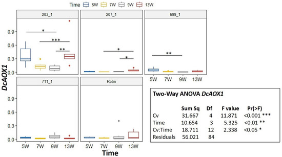 Expression box-plot and two-way ANOVA analysis for DcAOX1 during carrot root secondary growth in the cultivars (Cv) 203-1, 207-1, 699-1, 711-1 and ‘Rotin’. Transcript levels were determined by RT-qPCR. For each time point, four to six biological replicates were considered per cultivar. Significant differences in gene expression between time points are indicated by * (p < 0.05), ** (p < 0.01) or *** (p < 0.001). Boxplots show the distributions (median, spread and outliers) of the gene expression values.