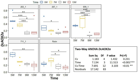 Expression box-plot and two-way ANOVA analysis for DcAOX2a during carrot root secondary growth in the cultivars (Cv) 203-1, 207-1, 699-1, 711-1, and ‘Rotin’. Transcript levels were determined by RT-qPCR. For each time point, four to six biological replicates were considered per cultivar. Significant differences in gene expression between time points are indicated by * (p < 0.05), ** (p < 0.01), or *** (p < 0.001). Boxplots show the distributions (median, spread and outliers) of the gene expression values.
