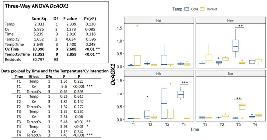 Expression box-plot and three-way ANOVA analysis for DcAOX1 during cold challenge (T1: 4 h, T2: 8 h, T3: 24 h, and T4: 7 days) in carrot cultivars (Cv) ’Nairobi’ (Nai), ‘Newcastle’ (New) ‘Nikki’ (Nik), and ‘Norwich’ (Nor). Transcript levels were determined by RT-qPCR. For each time point, four biological replicates were considered per temperature. Significant differences between temperatures for the same time point are indicated by * (p < 0.05), ** (p < 0.01) or *** (p < 0.001). Boxplots show the distributions (median, spread and outliers) of the gene expression values.