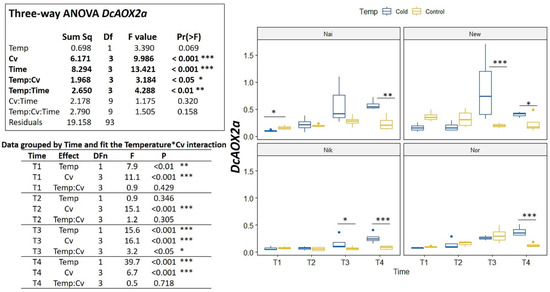 Expression box-plot and three-way ANOVA analysis for DcAOX2a during cold challenge (T1: 4 h, T2: 8 h, T3: 24 h and T4: 7 days), in carrot cultivars (Cv) ’Nairobi’ (Nai), ‘Newcastle’ (New) ‘Nikki’ (Nik), and ‘Norwich’ (Nor) eight weeks after sowing. Transcript levels were determined by RT-qPCR. For each time point, 10–12 biological replicates were considered per temperature. Significant differences between temperatures for the same time point are indicated by * (p < 0.05), ** (p < 0.01) or *** (p < 0.001). Boxplots show the distributions (median, spread and outliers) of the gene expression values.