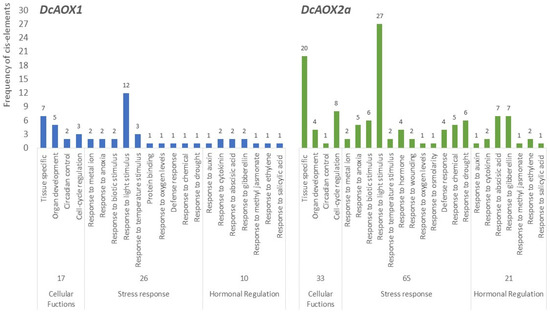 The region up to 2.0 kbp upstream from the translation start site of both DcAOX1 and DcAOX2a was scanned using PlantCare and NewPlace (databases of plant cis-acting regulatory DNA elements) for the identification of cis-acting regulatory elements putatively involved in plant growth and cold stress response. The analysis revealed a total of 52 putative CAREs in DcAOX1 while in DcAOX2 a total of 117 CAREs were identified. Accordingly with its putative functionality, CAREs were grouped into different categories (Figure 7): (i) related with cellular functions, (ii) responsive to stress conditions, and (iii) involved in hormonal regulation. In both genes, CAREs directly involved in plant stress response were the most frequent (DcAOX1 exhibited 25 and DcAOX2a 63). Nevertheless, the existence of crosstalk networks among phytohormones and target genes that enable plants to efficiently react upon stress, here grouped in the functional category of hormonal regulation, cannot be neglected. Supplementary Tables S2 and S3 list all CAREs identified by the in silico analysis.