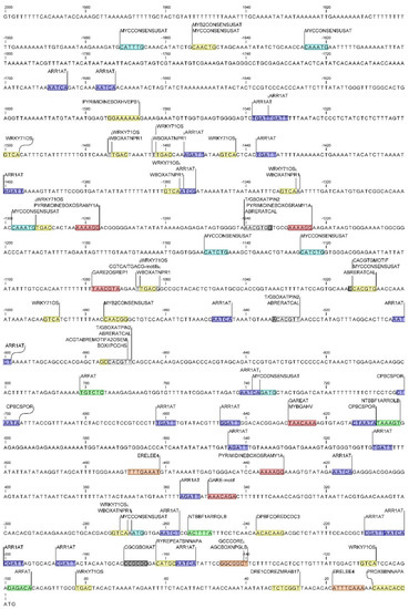 - Lescot, M.; Déhais, P.; Thijs, G.; Marchal, K.; Moreau, Y.; Van De Peer, Y.; Rouzé, P.; Rombauts, S. PlantCARE, a database of plant cis-acting regulatory elements and a portal to tools for in silico analysis of promoter sequences. Nucleic Acids Res. 2002, 30, 325–327. [Google Scholar] [CrossRef] [PubMed]