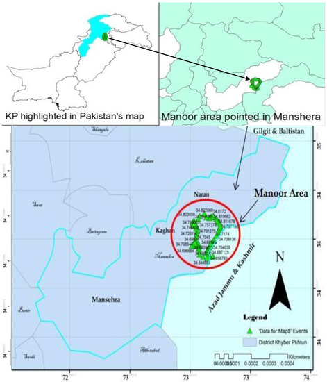 The current project lies in the ecotonal zone of the Manoor Valley. Manoor Valley is reached from the main Kaghan Valley road at the junction ‘Mahandri’ [20] and is about 50 km north of Balakot [21,22]. Geographically, Manoor Valley (Figure 1) is situated in northwestern Pakistan (34.68165 N to 34.83869 N latitude and 73.57520 E to 73.73182 E longitude) as a part of the mountainous series collectively known as the Himalayas [23]. The entire area is formed by crosswise ridges of mountains on either side of the Manoor river, which flows in a northeast to southwest direction down the valley emerged from Malika Parbat (‘Queen of Mountains’, elevation 5279 m).