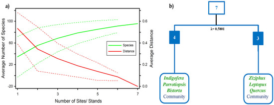 Compilation of records of plant diversity along the ecological gradients in the Himalayan Subtropical-Temperate Ecotone/Evergreen Oak Forest of the study area: (a) The species area curves of 97 plant species distributed among seven sampling sites; (b) TWINSPAN classification of the Himalayan Subtropical-Temperate Ecotonal zone of Manoor Valley.