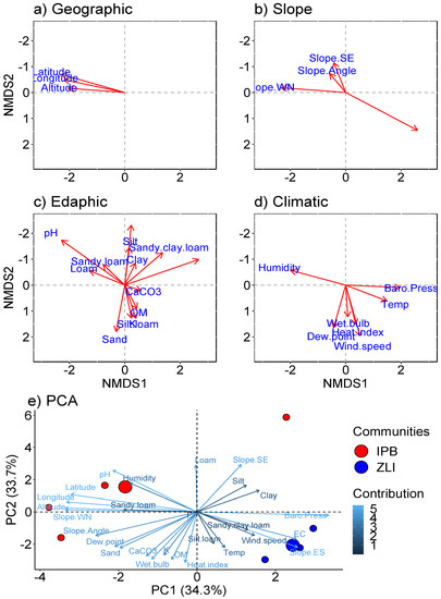 Multivariate analyses among plant communities of Himalayan Subtropical-Temperate Ecotone/Evergreen Oak Forest and ecological gradients. (a–d), Non-Multidimensional Scaling (NMDS) among vegetation communities and geographic (a), slope (b), edaphic (c), and climatic (d) gradients. (e) Principal Component Analysis (PCA) ordination of two plant communities along the ecological gradients. Species contribution analysis for community ordination in NMDS is depicted in Table 1. IPB: Indigofera-Parrotiopsis-Bistorta and ZLQ: Ziziphus-Letopus-Quercus.