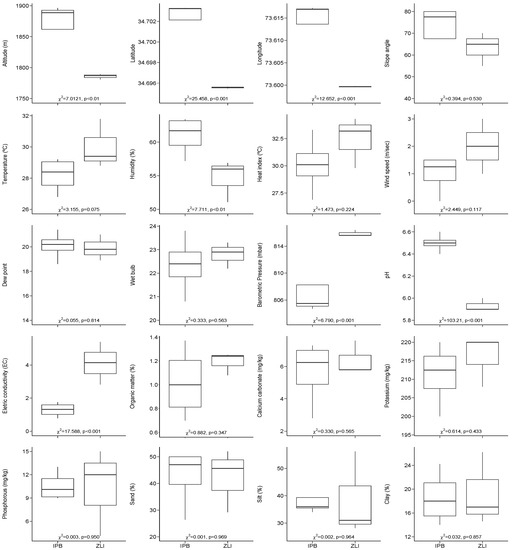 GLM analyses of the 20 studied variables distributed in different groups (geographic, slope, climatic and edaphic gradients) between two plant communities showed that most of the gradients were significantly different (p-value < 0.05; Figure 6). Nonetheless, slope angle, humidity, dew point, wind speed, wet bulb, organic matter, soil texture, potassium, and calcium carbonate did not show significant differences (Figure 6).