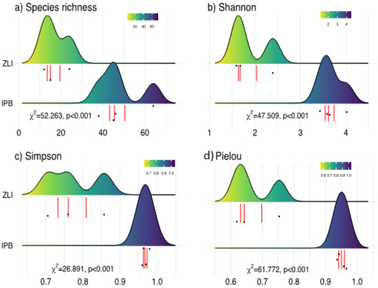 Species richness values ranged from 30 and 87 species in two plant communities (Figure 7a). The highest number of plant species was reported in the IPB community (87 species) at 1789.6–1896.3 m altitude, followed by ZLQ (30 species) at the altitudinal range of 1780.8–1789.3m. The Shannon Diversity index values ranged between 2.4 and 4 (Figure 7b). The IPB community had the maximum value (H’ = 4), followed by the ZLQ community (2.4). The Simpson’s dominance index values ranged between 0.86–0.98. The IPB community had the maximum value (0.98) between the recorded communities. Moreover, the lowest Simpson dominance value has been calculated for the ZLQ community (Figure 7c). The Pielou’s evenness index values ranged between 0.75 and 0.96 (Figure 7d). The IPB community had the maximum value (0.96); on the other hand, the ZLQ community had the lowest Pielous’s evenness value.