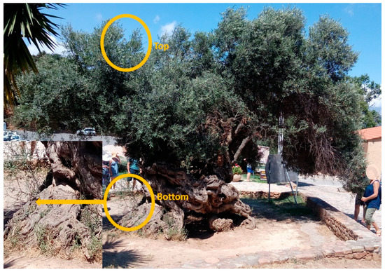 The millennial olive tree of Vouves in Crete is considered to consist of a Greek cv resembling ‘Mastoidis’ grafted onto an unknown ancient rootstock yielding a present-day “monumental” tree. A three-dimensional model of its trunk has been elaborated while the overall physiognomy is discussed [21]. Nevertheless, the tree trunk is presented as a compact object without differentiating between the two parts (top vs. bottom rootstock). In ancient times, olive domestication was based on selection of wild trees with desirable properties and grafting on other trees, as reported by Theophrastus more than 2000 years ago [22].