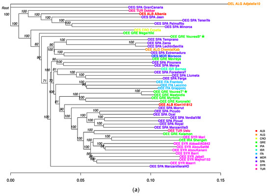 (a) Phylogenomic NJ tree made with the 71,040 filtered biallelic SNPs produced with whole genome resequencing data. Taxa names encode the subspecies (OEL, for Olea europaea subsp. laperrinei; OEG, Olea europaea subsp. guanchica; OES, Olea europaea var. sylvestris and OEE, Olea europaea subsp. europaea), country of origin, also with different colors [ALB (red), Albania; ALG (orange), Algeria; CRO (yellow), Croatia; GRE (light green), Greece; IRA (green), Iran; ISR (green-blue), Israel; ITA (light blue), Italy; MOR (blue), Morocco; SPA (purple), Spain; SYR (light purple), Syria and TUR (pink), Turkey] and variety name (n = 51). Bootstrap values are in cursive over their respective nodes. Target samples (Vouves Bottom and Top) have been marked with an asterisk (b) UPGMA similarity dendrogram of 12 present-day Greek cvs, the two Vouves samples and one “ancient” olive-tree genotype based on Jaccard’s index (n = 16). Distances based on Jaccard’s index are indicated on each branch of the tree. Olea europaea subsp. cuspidata (Wall. and G. Don) Cif. (denoted as OEC) was employed as an outgroup. Other taxa names correspond to the Olea europaea subsp. europaea (OEE) cvs (data from [36] reprocessed within the framework of present study). Distances are indicated above each tree branch.