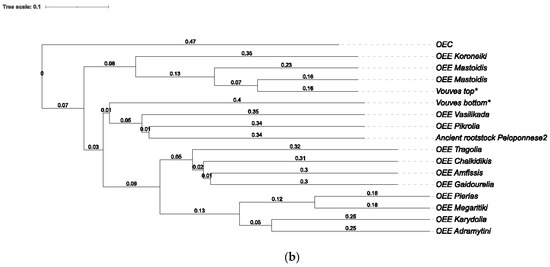 In the phylogenomic tree it can be seen that the Vouves tree bottom sample (more than 4000-year-old) is external to all the cultivated samples except for ‘Megaritiki’. The Vouves top tree sample is sister to the ‘Mastoidis’ accession and it clusters with other present Greek samples. The Italian samples (‘Frantoio’, ‘Leccino’ and ‘Grappolo’) are a monophyletic group as well as all the Syrian and Iranian accessions. The Spanish samples are divided into four groups. The first one is nested with two oleaster accessions (‘Extremadura’ and ‘Morocco’). The 1 (‘Pinonera’ and ‘Menya’) is sister to the Greek accession ‘Mavreya’. The third one (‘Farga’, ‘Llumeta’ and ‘Forastera de Tortosa’) are sister to the Israel accession ‘Barnea’. The fourth group contains accessions from southern Spain and is sister to the Syrian/Iranian clade. The ‘Kalamon’ accession is sister to the Turkish accession ‘Uslu’. In the UPGMA similarity tree produced with 11 SSR loci (Figure 2b) it can be seen that ‘Vouves bottom’ exhibits high similarity with another “ancient” rootstock from the Greek province of Peloponnese. This province is isolated from Crete by sea. Further, the Peloponnese rootstock shares high similarity with present-day Greek cvs “Pikrolia” and “Vasilikada’. This is in full agreement with a subsequent—yet unpublished—populational study involving few hundred olive tree samples from all over Greece genotyped with SSR markers. In this study each Greek cv is represented by a series of newly analyzed independent genotypes (data not shown).