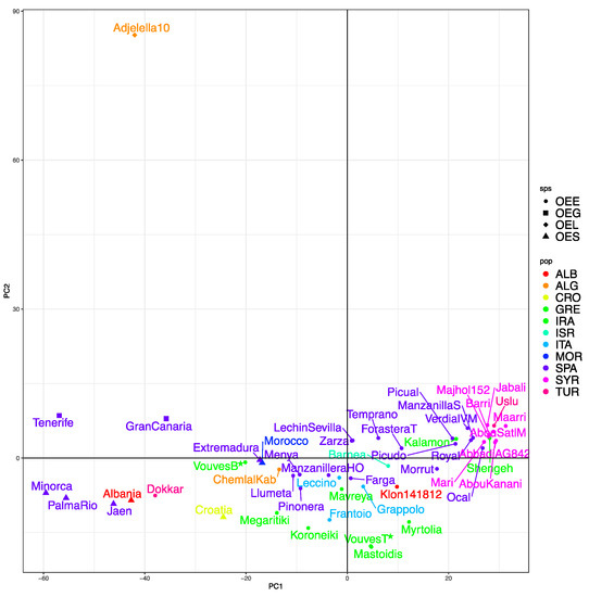 A PCA analysis on the samples show similar results (Figure 3). No cultivated subspecies or wild varieties such as O. europaea subsp. laperrinei (‘Adjelella10’), O. europaea subsp. guanchica (‘Tenerife’ and ‘Gran Canaria’) and O. europaea var. sylvestris (‘Minorca’, ‘PalmaRio’, ‘Jaen’, ‘Albania’, ‘Croatia’, ‘Extremadura’ and ‘Morocco’) appear to be separated from the main cluster of cultivated olives (O. europaea subsp. europaea). ‘Dokkar’ is close to the oleaster accessions, indicating a possible gene flow with the wild populations. The bottom of the Vouves tree is also close to the oleaster accessions, while the sample from the top of the tree clusters with the Greek accession ‘Mastoidis’ (Figure 3).
