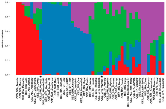 Admixture analysis for K = 4. Four populations are represented with the following colors: Red (noted in the text as G1) composed mostly by wild accessions (Olea europaea subsp. laperrinei; Olea europaea subsp. guanchica; and Olea europaea var. sylvestris); Purple (noted in the text as G2) has southern Spain accessions and some Olea europaea var. sylvestris; Blue (noted in the main text as G3) is composed by individuals from Syria and Iran; Green (noted in the text as G4) present-day Greek and Italian accessions and some accessions from north-western Spain. Vouves tree samples have been marked with a star.