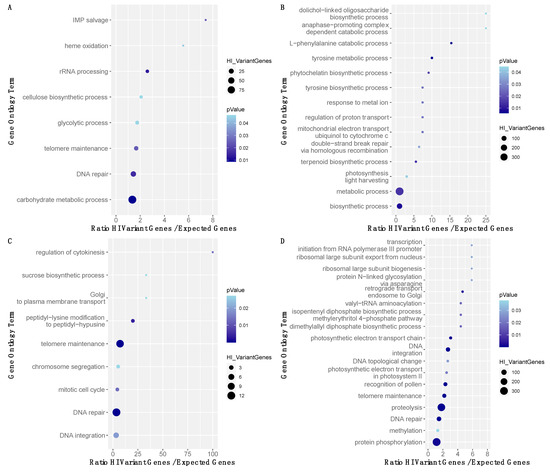 Gene Ontology analysis of the genes affected by high impact variants. The x-axis represents the value of the over or under-representation of these categories. The size of the dot represents the number of genes of the category and the color intensity its statistical significance as p-value. (A) Vouves bottom tree sample; (B) Vouves top tree sample; (C) High impact changes shared by all the Greek accessions (‘Kalamon’, ‘Koroneiki’, ‘Mastoidis’, ‘Mavreya’, ‘Megaritiki’ and ‘Myrtolia’) but absent in the Vouves tree; (D) Genes affected by high impact variants common for all the datasets (Vouves tree and Greek accessions).