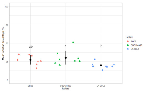 Mean inhibition percentage of growth radius for Trichoderma atroviride strain I-1237 against Lasiodiplodia theobromae isolates Bt105 and LA-SOL3 and Lasiodiplodia mediterranea isolate CBS124060. Dots and triangles represent data from both experiments, black dots represent the mean percentage of growth inhibition for the total replicates of both experiments and black bars represent the standard error of means. Columns with the same letter (a,b) are not significantly different according to Tukey’s test (p = 0.05).