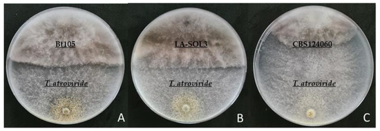 Dual culture antagonism assay of T. atroviride strain I-1237 and the three Lasiodiplodia spp. isolates under study. (A) isolate Bt105; (B) isolate LA-SOL3; (C) isolate CBS124060.