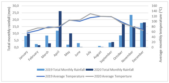 For both years of the experiment, daily temperature and rainfall were obtained from the Portuguese Institute for Sea and Atmosphere (IPMA—Instituto do Mar e da Atmosfera). These data were collected on the Lisbon reference meteorological station, which is located approximately 7 km from the vineyard tested.