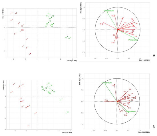 Principal component analysis (PCA) for the interactions of all treatments, 15 variables including all the product/isolate combinations (T represents the treatment numbers which are stated in Table 2), as well as inoculated controls on both variables and the meteorological variables (Figure 2). Red marks represent the observations for Cabernet Sauvignon (CS) and green marks represent the Touriga Nacional (TN) observations. (A)-PCA analysis for 2019; (B)-PCA analysis for 2020.